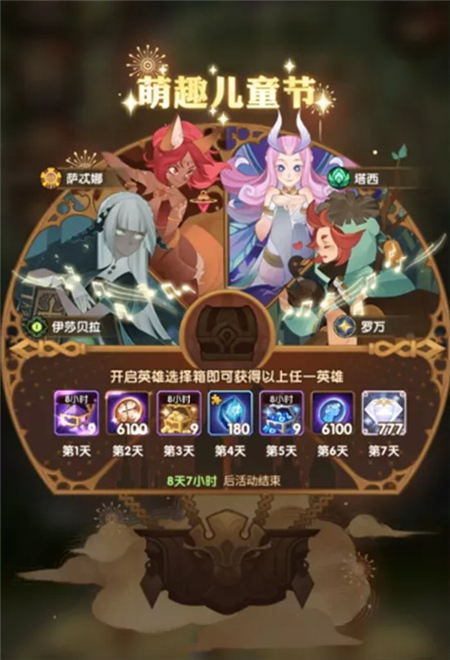 活动期间,每天登录游戏就能领到儿童节福利,钻石、英雄粉尘、经验全都有。等所有奖励都领完,还会送个英雄宝箱,里面有罗万、塔西、萨忒娜、伊莎贝拉四个英雄。