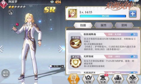 其次就是新手赠送的SR英雄阿波罗。这个英雄你看起来好像不猛,但你要搞清楚,他的灼烧技能是群体,2费1人一个buff,可叠加5层,一次4%,这是真实伤害!!五层满之后是20%,不奶5回合必死。这个英雄前期看起来伤害很低,一下只能跳一点点伤害,但那是因为前期小怪的血量很低!可以在后期打出奶dot流。如果你抽到加百列,那不说了,阿波罗洛基加百列,随便带两苟奶或者带一奶一盾,三回合直接起飞,对面血崩,没有你秒不掉的坦克。